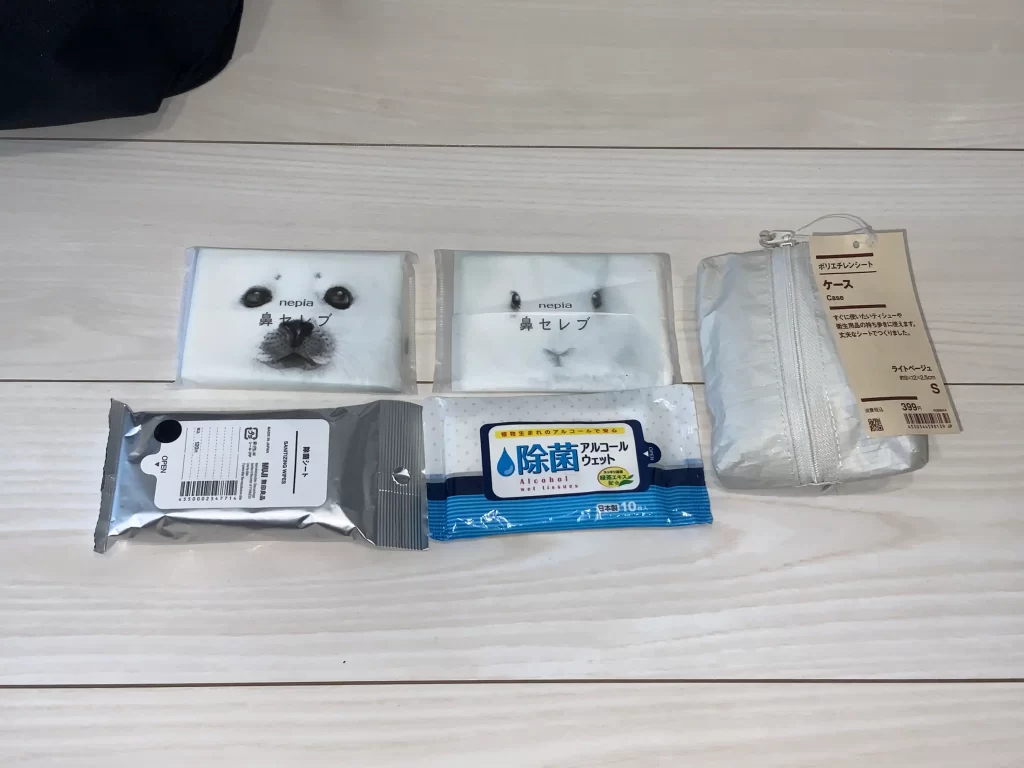 いつもはこんな感じでティッシュと除菌シートを持ち歩いているのですが、